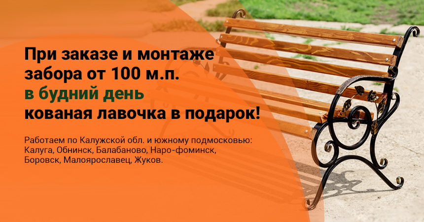 При заказе забора от 100 м.п. и монтаже в будний день кованая лавочка в подарок.